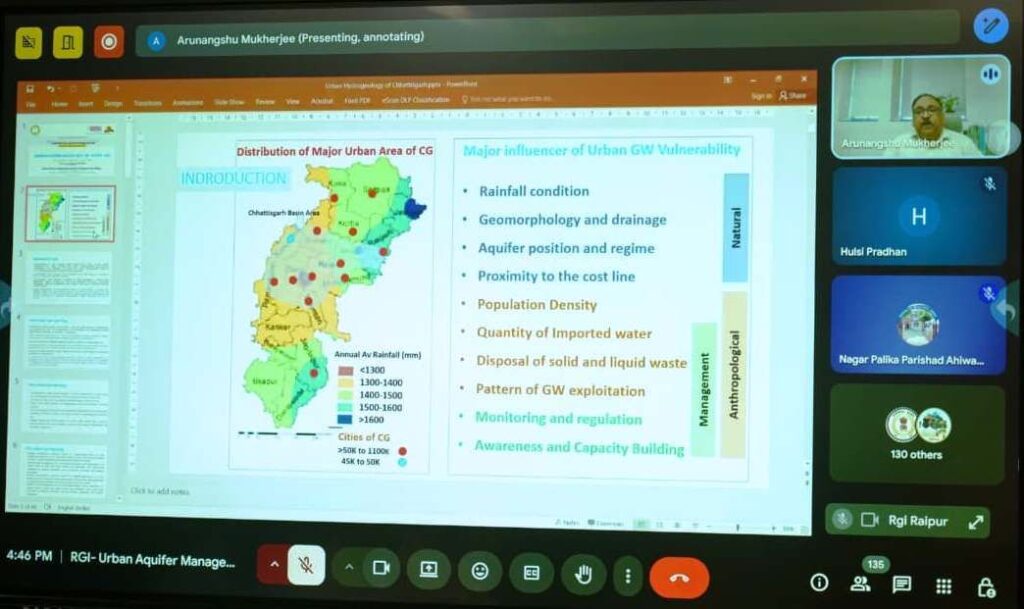 प्रदेशभर के नगरीय निकायों के वरिष्ठतम अधिकारियों और अभियंताओं को अर्बन एक्वीफर मैनेजमेंट विषय पर देश-विदेश के विशेषज्ञ प्रशिक्षण दे रहे हैं। प्रशिक्षण के पहले दिन 22 सितम्बर को राजीव गांधी राष्ट्रीय भूमिजल प्रशिक्षण एवं अनुसंधान संस्थान, नवा रायपुर की वैज्ञानिक सुश्री बिजिमोल जोस के साथ ही सीजीडब्ल्यूबी, चेन्नई के वैज्ञानिक डॉ. एम. सेंथिल कुमार ने शहरी क्षेत्रों के जल भू-विज्ञान के बारे में जानकारी दी। वहीं मानव रचना इंटरनेशनल इंस्टीट्यूट ऑफ रिसर्च एंड स्टडीज, फरीदाबाद के प्राध्यापक डॉ. अरुणांग्शु मुखर्जी ने छत्तीसगढ़ के प्रमुख शहरों में भू-जल परिदृश्य के बारे में बताया।