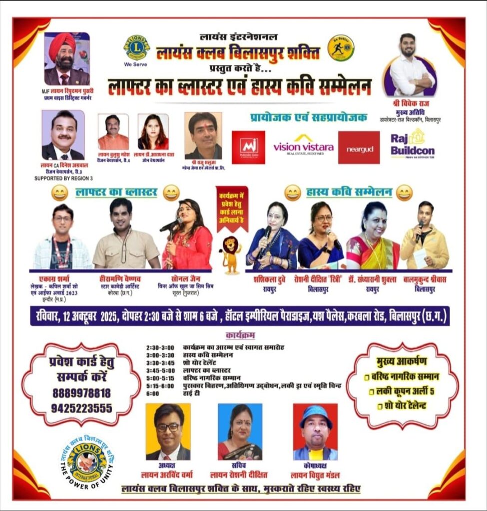 लायंस क्लब बिलासपुर शक्ति ला रहा है लाफ़्टर का ब्लास्टर जहाँ हंसी वहां खुशी जहाँ खुशी,वहां तंदुरुस्त जी हाँ,मानसिक स्वास्थ्य एवं तंदुरुस्ती सेवा सप्ताह के समापन में,लायंस क्लब बिलासपुर शक्ति ला रहा है “लाफ़्टर का ब्लास्टर”,जिसमें होगी सिर्फ और सिर्फ हंसी और ठहाकों का मेला।