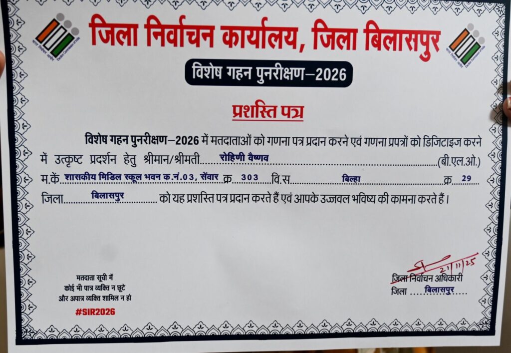बिलासपुर, 21 नवम्बर 2025/कलेक्टर एवं जिला निर्वाचन अधिकारी संजय अग्रवाल ने बिल्हा विधानसभा क्षेत्र के मतदान केन्द्र सेंवार की बीएलओ रोहिणी वैष्णव को प्रशस्ति पत्र देकर सम्मानित किया है। उनके द्वारा मतदाता सूची के विशेष गहन पुनरीक्षण कार्य में उत्कृष्ट कार्य किया गया है। रोहिणी इस गांव में आंगनबाडी कार्यकर्ता के रूप में कार्यरत हैं। उन्होंने 21 नवम्बर तक कुल 1032 मतदाताओं में से 993 मतदाताओं को गणना पत्र प्रदान करने के साथ ही गणना पत्रों के डिजिटाईजेशन का कार्य पूर्ण कर लिया है। जबकि अभियान के संपन्न होने में अभी 13 दिन बचे हुए हैं। मालूम हो कि मुख्य निर्वाचन पदाधिकारी, रायपुर द्वारा रोहिणी को जिले की बेस्ट बीएलओ के रूप में चिन्हित किया गया है। कलेक्टर ने इस अवसर पर इलाके के सुपरवाईजर एवं महिला पटवारी कविता भानु को भी गुलदस्ता भेंटकर सम्मानित किया। इस अवसर पर उप जिला निर्वाचन अधिकारी एवं अपर कलेक्टर शिवकुमार बनर्जी भी उपस्थित थे। उन्होंने बताया कि विशेष गहन पुनरीक्षण अभियान में अच्छे कार्य करने वाले बीएलओ एवं सुपरवाईजरों को जिला स्तर पर भी सम्मानित किया जायेगा।