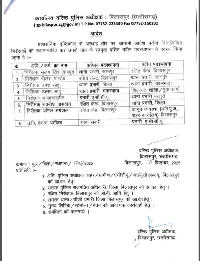 बिलासपुर जिले के कई थाना प्रभारियों का हुआ तबादला.. एसएसपी रजनेश सिंह ने किया फेरबदल