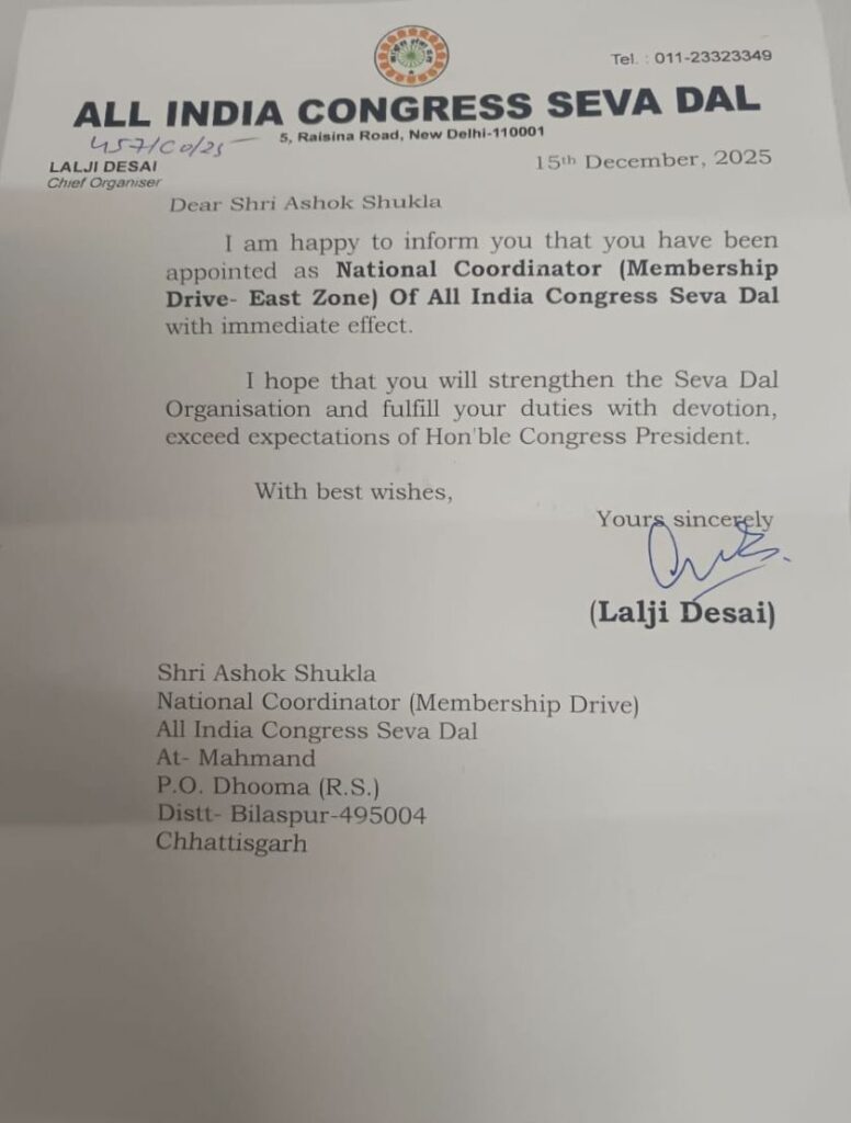 नई दिल्ली / रायपुर: अखिल भारतीय कांग्रेस सेवादल में सांगठनिक मजबूती और सदस्यता अभियान को धार देने के उद्देश्य से एक बड़ा फेरबदल किया गया है। कांग्रेस सेवादल के राष्ट्रीय अध्यक्ष श्री लाल जी देसाई ने छत्तीसगढ़ के अनुभवी नेता और पूर्व अतिरिक्त मुख्य संगठक अशोक शुक्ला को एक बड़ी जिम्मेदारी सौंपते हुए उन्हें पूर्वी जोन (Eastern Zone) का राष्ट्रीय समन्वयक (National Coordinator) नियुक्त किया है।