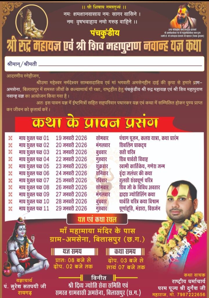 बिलासपुर के निकट ग्राम रूद्र अमसेना में पंच कुंडीय महायज्ञ एवं संगीत मय शिव महापुराण यज्ञ कथा का आयोजन समस्त जीवों के कल्याणार्थ गौ रक्षा राष्ट्रीय हित हेतु पंच कुंडीय रुद्र महायज्ञ का आगामी 19 जनवरी 2026 सोमवार से पंचांग पूजन कलश यात्रा के साथ कथा प्रारंभ होने जा रहा है जिसकी तैयारियां जोरो से चल रही है। इस यज्ञ एवं कथा में भारी संख्या श्रद्धालु भक्त गणों की उपस्थिति रहेगी।