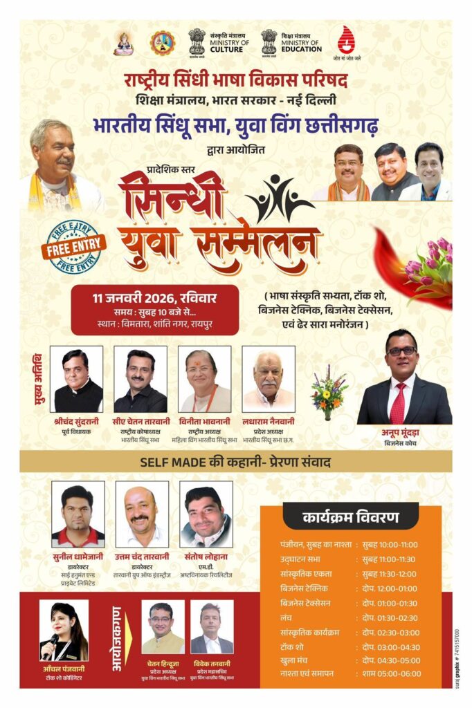 रायपुर ! भारतीय सिंधू सभा, छत्तीसगढ़ युवा शाखा द्बारा, प्रदेश स्तरीय, एक दिवसीय सिंधी युवा सम्मेलन स्थानीय विमतारा भवन में रविवार 11.1.26 को आयोजित किया जा रहा है.