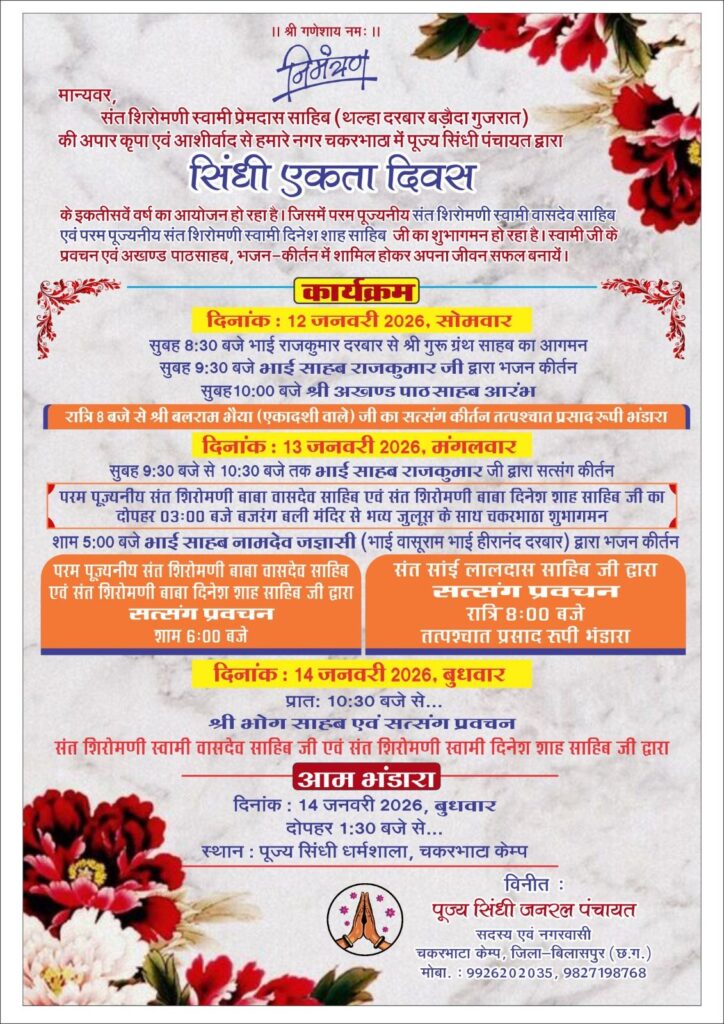 चकरभाठा, बिलासपुर: पूज्य सिंधी पंचायत, चकरभाठा द्वारा समाज की एकता, अखंडता और आध्यात्मिक चेतना को समर्पित ‘सिंधी एकता दिवस’ के इकतीसवें (31वें) वर्ष का भव्य आयोजन आगामी 12 जनवरी से 14 जनवरी 2026 तक किया जा रहा है। इस ऐतिहासिक महोत्सव में विश्व प्रसिद्ध संत शिरोमणि स्वामी वासदेव साहिब एवं परम पूज्यनीय संत शिरोमणि स्वामी दिनेश शाह साहिब जी का पावन सानिध्य प्राप्त होने जा रहा है। संतों के शुभागमन को लेकर चकरभाठा के सिंधी समाज सहित पूरे क्षेत्र के श्रद्धालुओं में भारी उत्साह देखा जा रहा है।