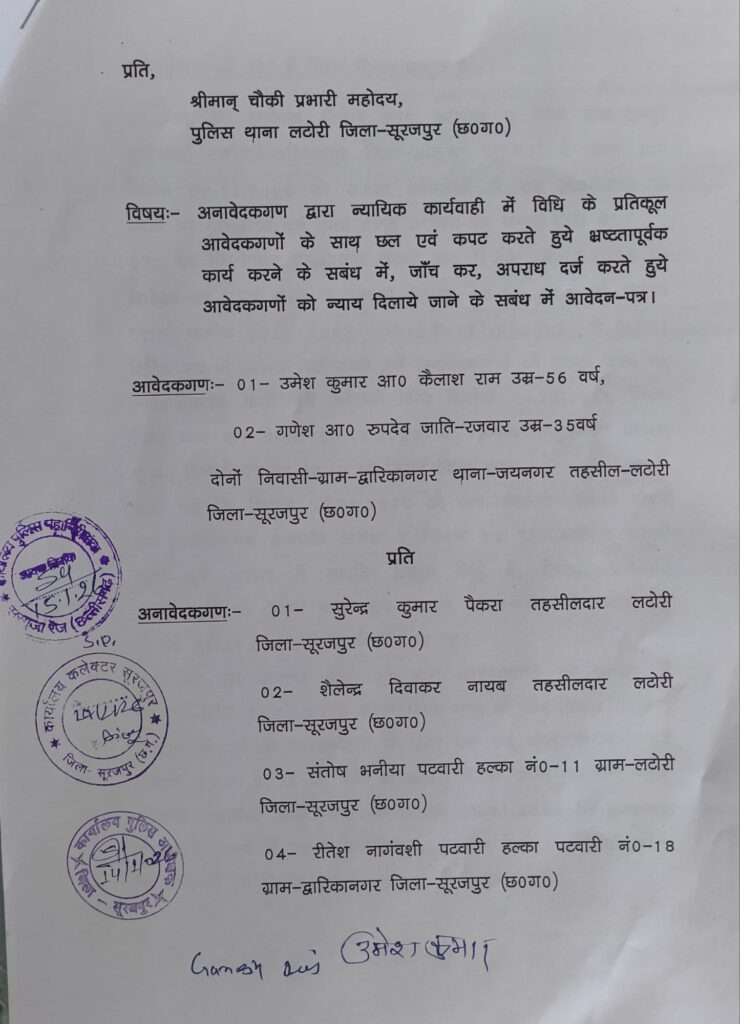 इस मामले में पीड़ित पक्ष ने तहसीलदार सुरेंद्र पैंकरा, नायब तहसीलदार शैलेन्द्र दिवाकर और हल्का पटवारी संतोष भनिया व रितेश नागवंशी पर गंभीर आरोप लगाते हुए कलेक्टर सूरजपुर, पुलिस अधीक्षक सूरजपुर और पुलिस महानिरीक्षक सरगुजा रेंज से लिखित शिकायत की है।