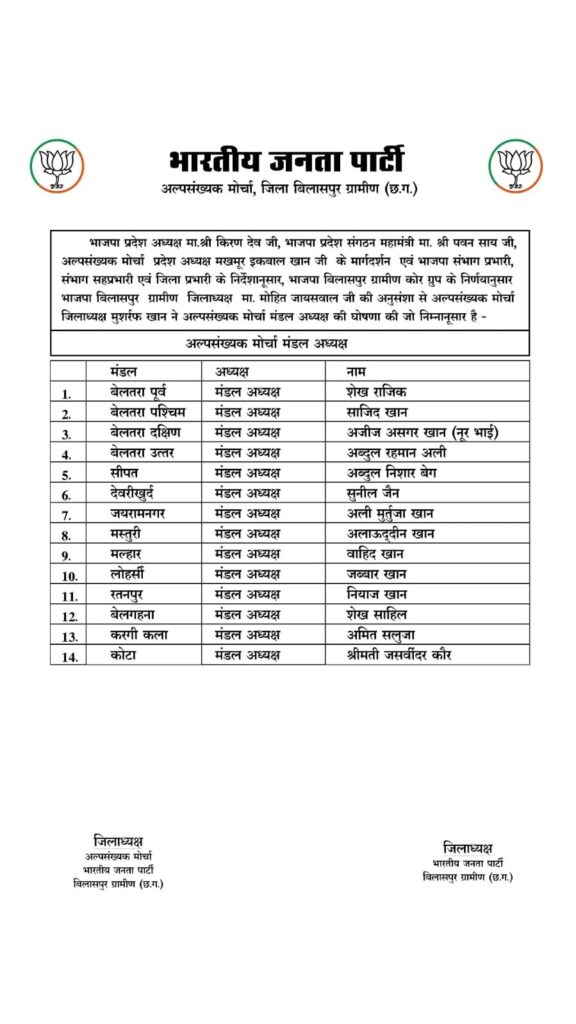 बिलासपुर भाजपा अल्पसंख्यक मोर्चा की कार्यकारिणी घोषित: शेख राजिक को बेलतरा पूर्व की जिम्मेदारी, 14 मंडलों में अध्यक्ष नियुक्त