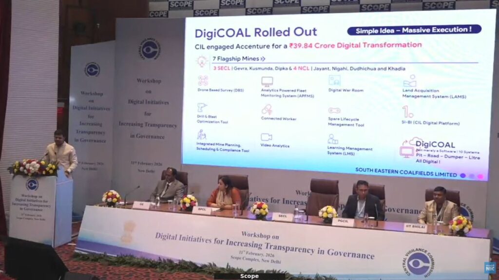 बिलासपुर/केन्द्रीय सतर्कता आयोग द्वारा 11 फरवरी 2026 को नई दिल्ली स्थित स्कोप कन्वेंशन सेंटर में “डिजिटल इनिशिएटिव्स फॉर इंक्रीजिंग ट्रांसपेरेंसी इन गवर्नेंस” विषय पर आयोजित राष्ट्रीय कार्यशाला में साउथ ईस्टर्न कोलफील्ड्स लिमिटेड (SECL) की डिजिटल ट्रांसफॉर्मेशन पहल ‘डिजीकोल (DigiCOAL)’ को सार्वजनिक उपक्रमों में पारदर्शिता, दक्षता और जवाबदेही बढ़ाने वाली एक आदर्श डिजिटल पहल के रूप में प्रस्तुत किया गया।