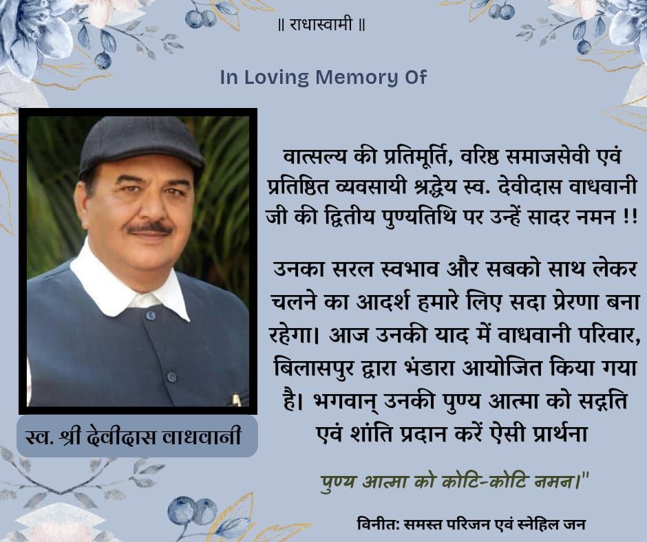 बिलासपुर | 18 फरवरी, 2026बिलासपुर शहर के प्रतिष्ठित व्यवसायी, सिंधी समाज के गौरव और वरिष्ठ समाजसेवी श्रद्धेय स्व. देवीदास वाधवानी जी की द्वितीय पुण्यतिथि कल, 19 फरवरी 2026 को अत्यंत श्रद्धा और गरिमा के साथ मनाई जाएगी। इस पावन स्मृति के अवसर पर वाधवानी परिवार द्वारा विशेष श्रद्धांजलि सभा एवं विशाल भंडारे का आयोजन किया गया है।