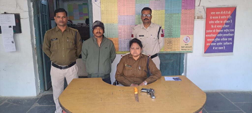 कि मुखबीर की सूचना के अधार से थाना सिटी कोतवाली पुलिस द्वारा दबिश देकर आरोपी – सुमित वर्मा पिता मित लाल वर्मा उम्र 29 वर्ष निवासी संतोषी के पास कतियापारा जुना बिलासपुर थाना सिटी कोतवाली जिला बिलासपुर को कतियापारा से पकडा गया जिसके पास एक धारदार चाकू एवं स्टील प्लास्टि का पिस्टल नुमा दिखने वाला लाईटर मिला