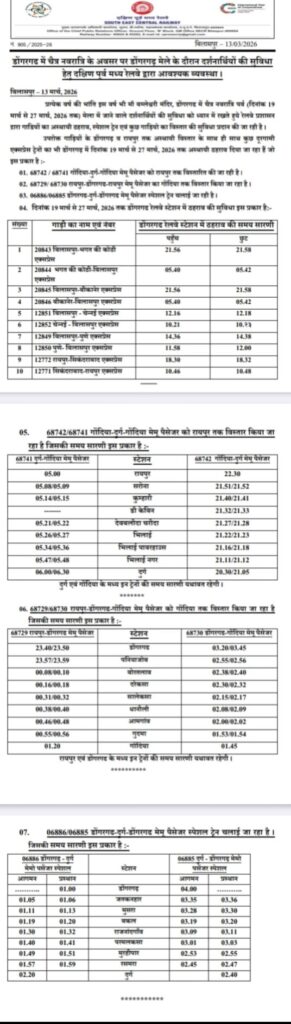 इस वर्ष चैत्र नवरात्रि मेला दिनांक 19 मार्च से 27 मार्च 2026 तक आयोजित किया जा रहा है। श्रद्धालुओं की सुविधा को ध्यान में रखते हुए दक्षिण पूर्व मध्य रेलवे द्वारा विशेष व्यवस्थाएँ की गई हैं। इसके अंतर्गत कुछ गाड़ियों का अस्थायी ठहराव, कुछ ट्रेनों का अस्थायी विस्तार तथा एक मेमू पैसेंजर स्पेशल ट्रेन चलाने का निर्णय लिया गया है, जिससे श्रद्धालुओं को यात्रा में अधिक सुविधा प्राप्त हो सके। विस्तृत जानकारी नीचे दिया गया है