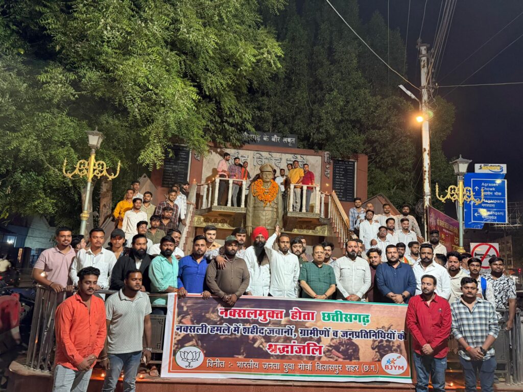बिलासपुर | डबल इंजन सरकार के प्रभावी पुनर्वास कार्यक्रम और निरंतर सुरक्षा अभियानों के परिणामस्वरूप बस्तर के ‘नक्सल मुक्त’ घोषित होने की ऐतिहासिक उपलब्धि पर भारतीय जनता युवा मोर्चा (भाजयुमो) जिला बिलासपुर शहर द्वारा वीर शहीदों को भावपूर्ण श्रद्धांजलि अर्पित की गई।