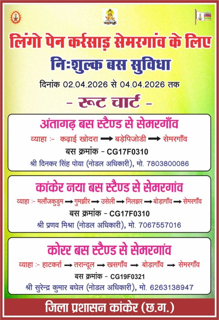 अंतागढ़ विकाखण्ड में आमाबेड़ा के पास स्थित ग्राम सेमरगांव में 02 से 04 अप्रैल तक आयोजित होने वाले लिंगों पेन कर्रसाड़़ स्थल तक आवागमन के लिए जिला प्रशासन कांकेर द्वारा निःशुल्क बस सुविधा उपलब्ध कराई जा रही है। कर्रसाड़ अवधि में अंतागढ़ से सेमरगांव, कांकेर से सेमरगांव, और कोरर से सेमरगांव के लिए बस संचालित की जाएगी।