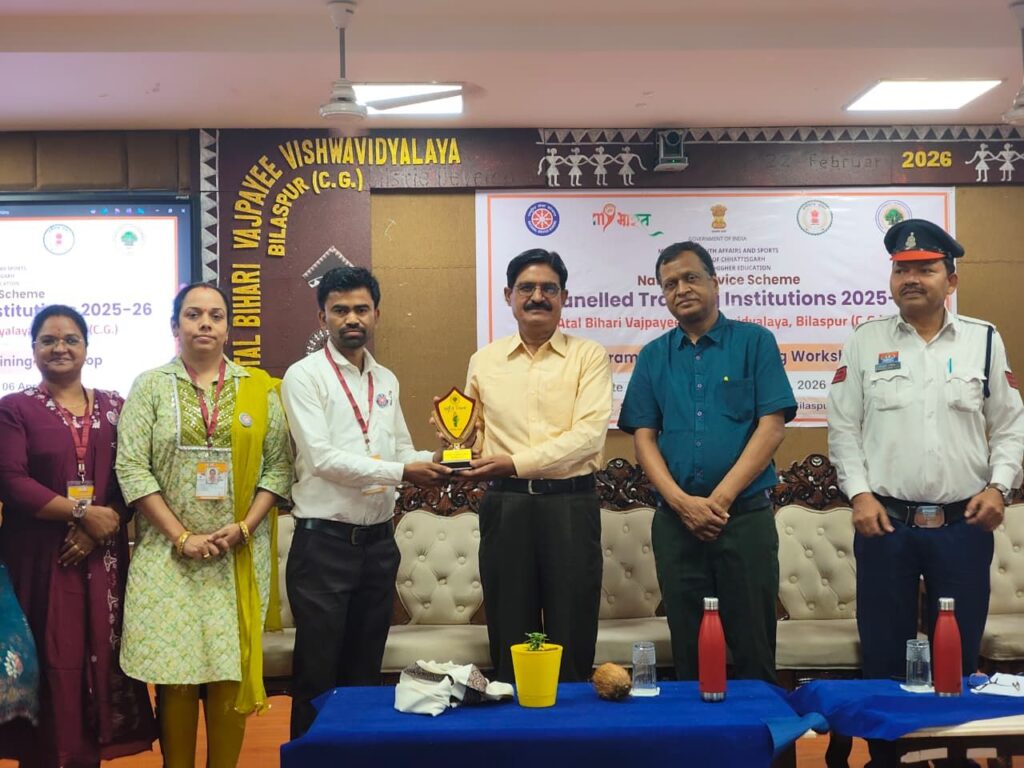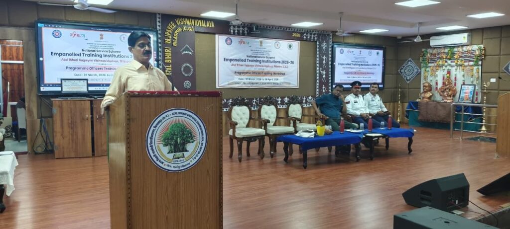 आज दिनांक 3.4.2026 को अटल बिहारी वाजपेई विश्वविद्यालय बिलासपुर में जिले के सभी विद्यालय एवं महाविद्यालय के राष्ट्रीय सेवा योजना इकाई के प्रभारियों के एक सप्ताह के प्रशिक्षण कार्यक्रम अंतर्गत आज पुलिस उप महानिरीक्षक एवं वरिष्ठ पुलिस अधीक्षक श्री राजनेश सिंह के दिशा निर्देश एवं यातायात बिलासपुर के अतिरिक्त पुलिस अधीक्षक यातायात रामगोपाल करियारे के पर्यवेक्षण में यातायात की पाठशाला का आयोजन किया गया। जिसमें उपस्थित विश्वविद्यालय एवं महाविद्यालय के सभी अध्यापकों को सड़क सुरक्षा के नियम, सड़क दुर्घटना के कारण, निवारण, तथा राहगीर योजना के साथ-साथ ITMS की सविस्तार जानकारी दी गई।