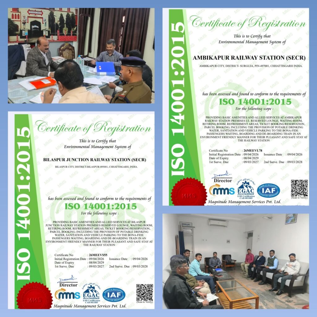ISO 14001:2015 प्रमाणन प्राप्त करना इस बात का प्रमाण है कि बिलासपुर मंडल न केवल उत्कृष्ट रेल संचालन के लिए प्रतिबद्ध है, बल्कि पर्यावरण संरक्षण, स्वच्छता एवं सतत विकास के प्रति भी पूरी निष्ठा से कार्य कर रहा है।